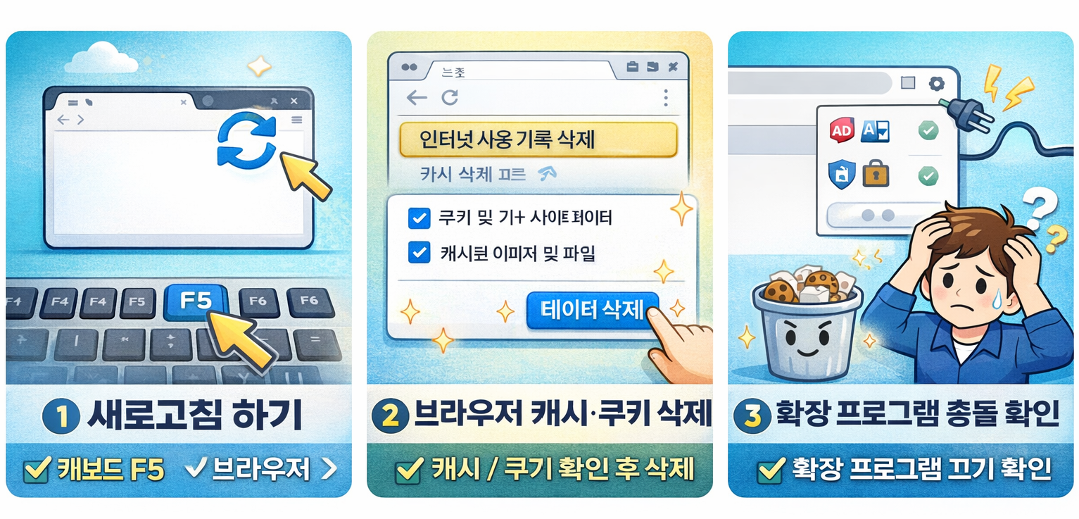 브라우저 캐시 문제나 확장 프로그램 충돌 때문에 발생하는 경우가 많습니다.